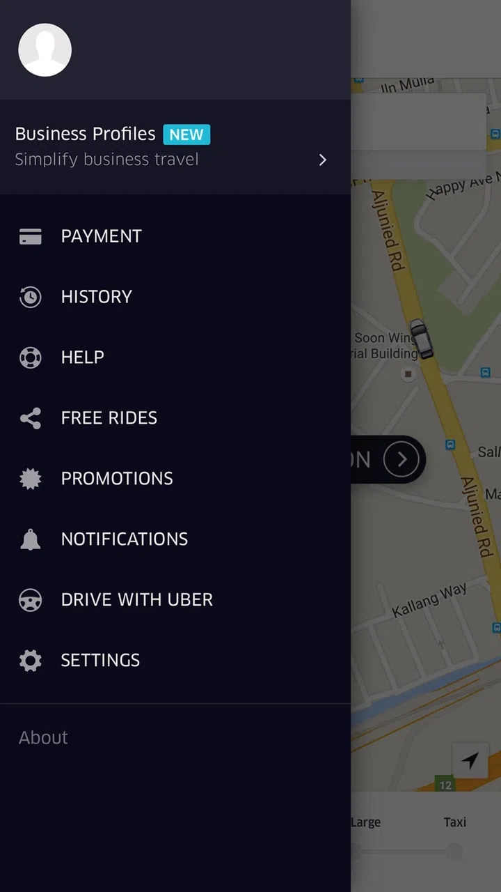 First, open the Uber app and bring up the profile management menu by swiping right from the left edge, or by tapping the menu icon in the top-left corner. Tap on the Help option to begin.