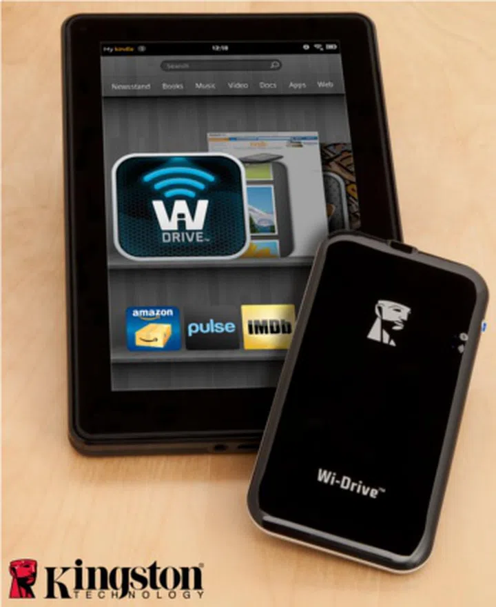 Kingston Wi-Drive was first released in 2011 for Apple devices and can now be used for the Android-based Kindle Fire tablet. The app, available on the Amazon Appstore for Android, allows Kindle Fire users to expand the capacity of the device beyond the 8GB of internal storage.