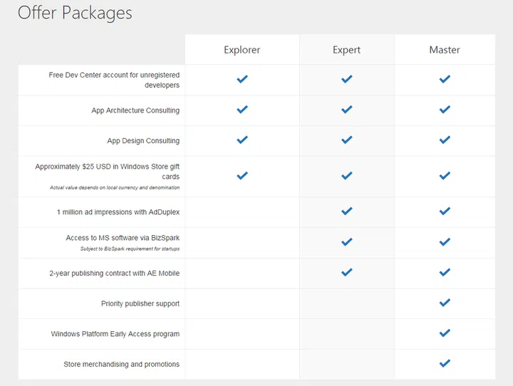In addition to the fee removal, Microsoft has revamped its Dev Center Benefits program, which helps developers to develop, improve and market their apps with a variety of tools. There are three offer packages in the program, tailored by experience level: