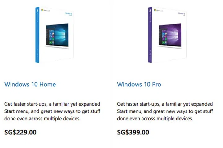 While Windows 10 is available in DVD and USB flash media elsewhere, neither boxed version will be sold in retail stores in Singapore. So if you aren’t eligible for the free upgrade offer (e.g., those clinging on to Windows XP and Vista), you can purchase it over at the Microsoft Singapore online store. There are two versions, Windows 10 Home and Windows 10 Pro, and they go for S$229 and S$399 respectively. At the moment, both are listed as 'coming soon'. A Windows 10 Pro Pack for those who bought Windows 10 Home and later wished to upgrade to the Pro version is supposedly coming, but it isn't listed on the Store yet.