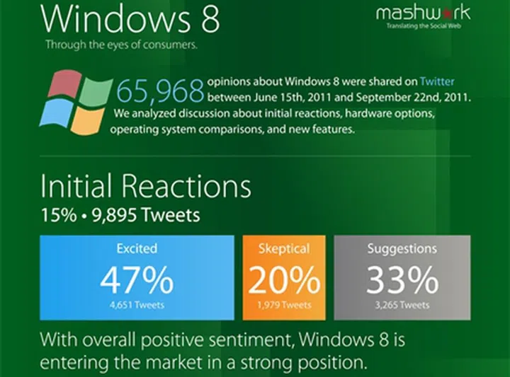Mashwork did an analysis of Twitter conversations between June 15 and September 22, and reported that Microsoft Windows 8 received overwhelming positive feedback.