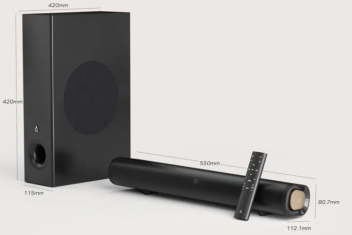 As for the hardware, you’ll find full-range racetrack drivers measuring 2.17 x 3.35 inches. Bass is supported by a long-throw subwoofer, with the woofer driver measuring 5.25 inches. The rated peak power output on the Stage Pro is 160W, not quite the 240W found on the Stage 360, but on par with the Stage V2. The Stage Pro soundbar itself measures 550 x 112 x 81mm, so it’s not especially long, but it does have a slightly longer width compared to other Stage soundbars. The subwoofer measures 115 x 265 x 420mm.