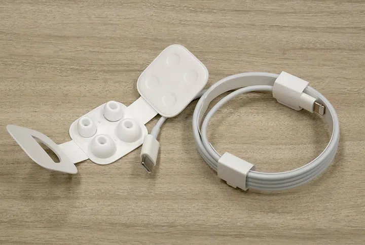 Inside the little white box, you’ll find two additional silicone ear tips (small and large) and also a charging cable. Interestingly, the supplied charging cable is now a USB-C to Lightning charging cable. This is good news for anyone with a fairly new MacBook.