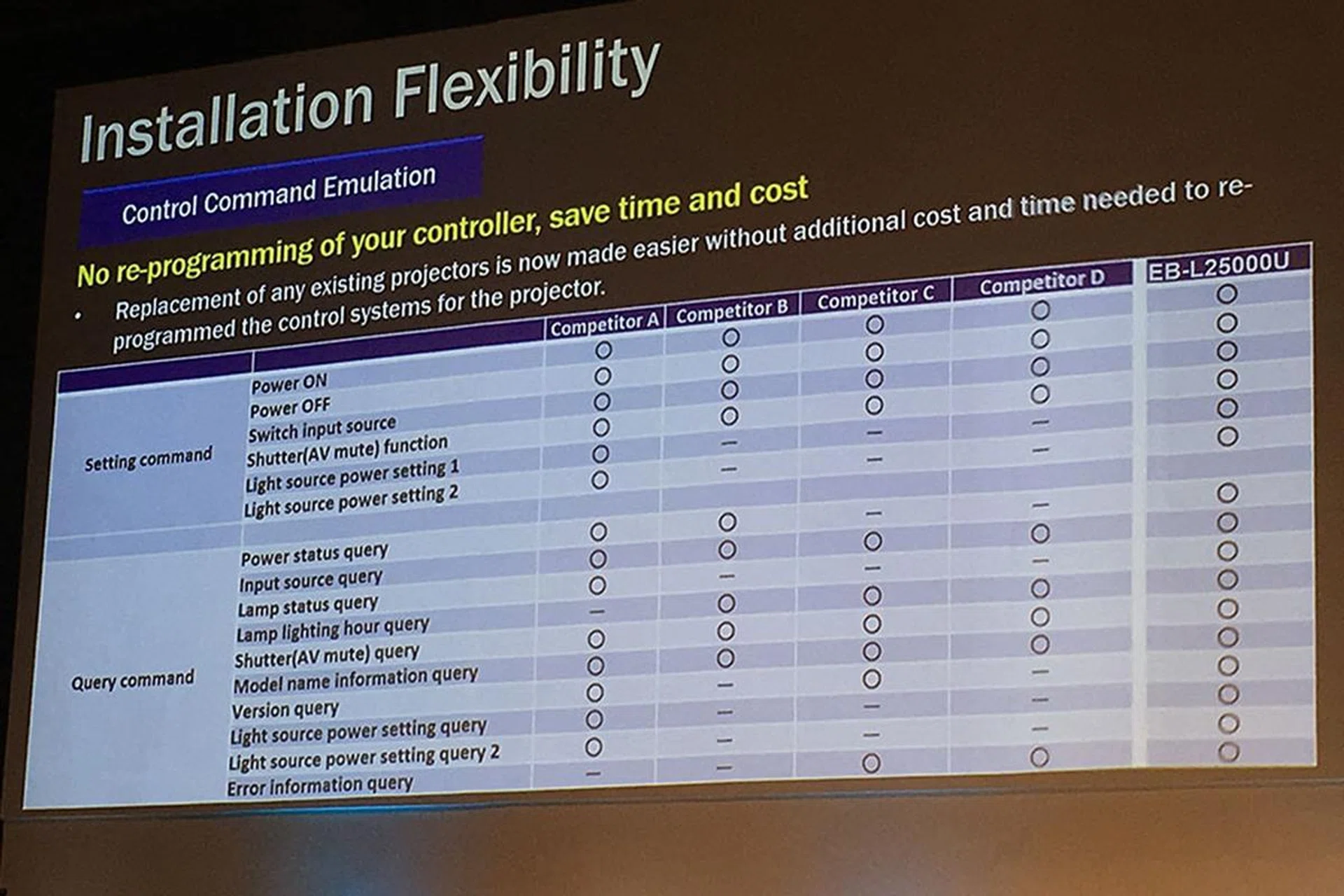 In case you missed it, most if not all these features that I’ve just covered also apply to the EB-L1000 laser projector series, and vice versa. And that means features like 360-degree projection (including a portrait mode), advanced edge blending and color management system, auto image calibration with a built-in camera, eight optional interchangeable lenses with powered lens shift and lens memory, and compatibility with integration tools like Crestron RoomView, AMX, Extron XTP, Control3, and DMX Art-Net lighting control systems, plus an emulation mode for basic control of other projector brands are all available to EB-L25000U users.