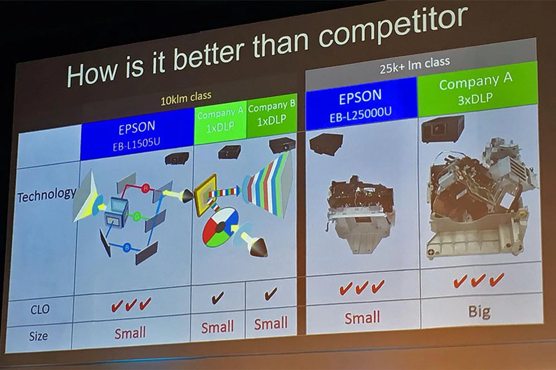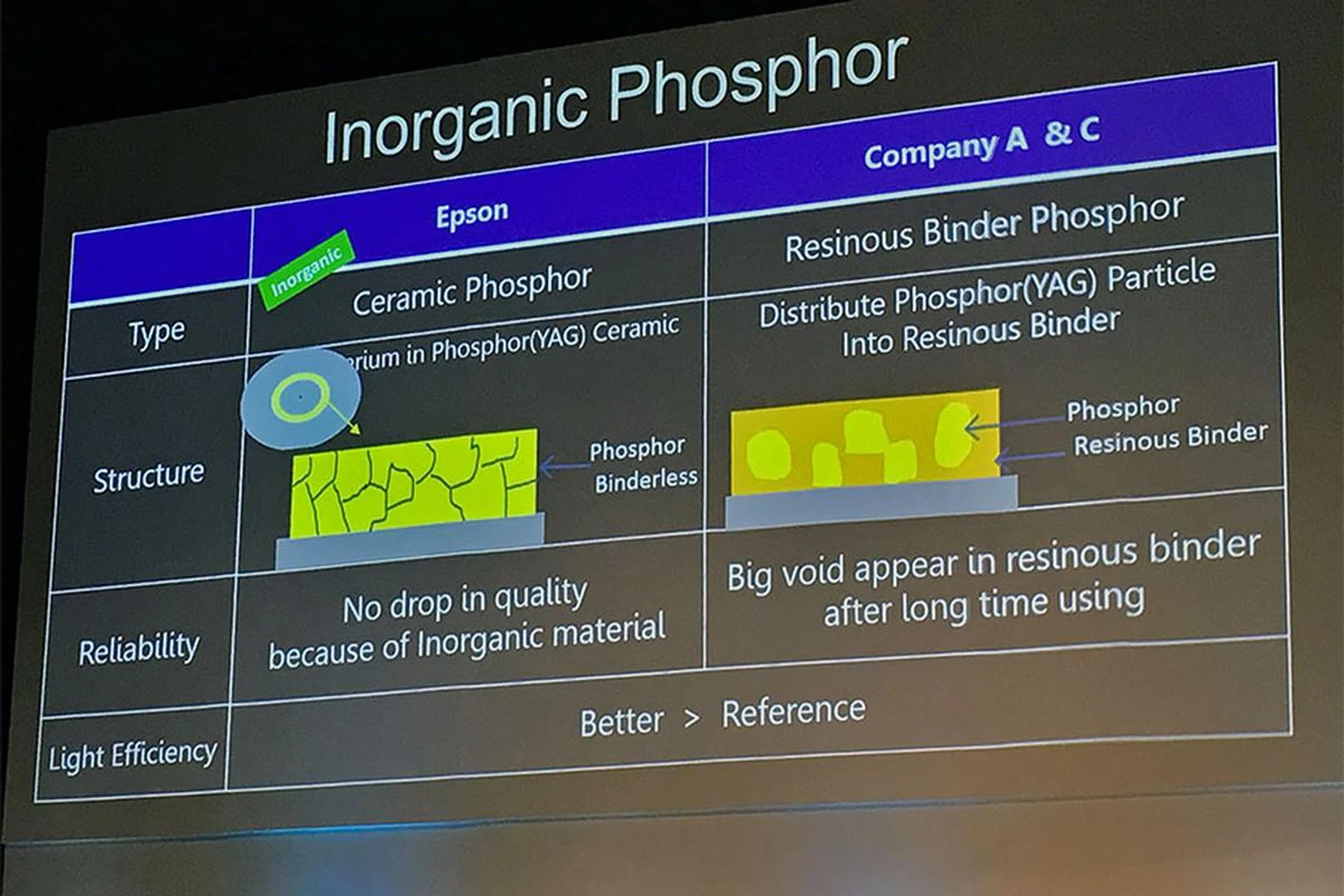 Also noteworthy is that despite Epson’s domination in the 3LCD and business projector market (34% share worldwide in Q1 ’16), when it comes to using laser as a light source in projectors, it’s a latecomer. (Fellow Japanese projector makers like Casio, NEC, Panasonic, and Sony, and lately, Canon, have all dabbled with laser one way or another.) Epson admits it too, but stresses the delay was due to it wanting to overcome brightness stability and color issues that so often plagued early laser projectors.
