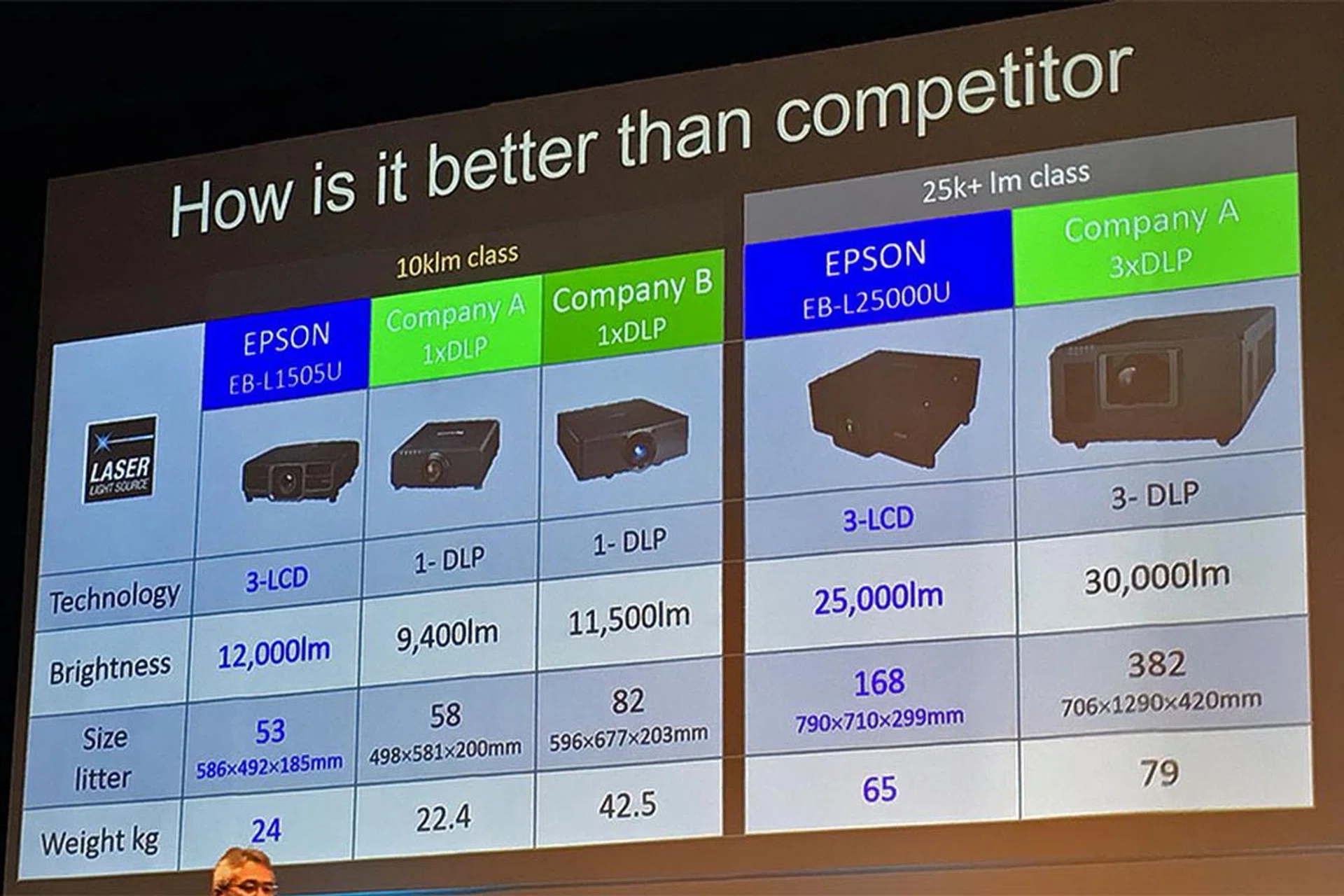 Like the L1000 series, the EB-L25000U can be viewed as yet another proof of Epson’s determination to make inroads into the rental and staging market. A lucrative space with strong existing players like Panasonic, the new laser lineup also fits right into the company’s ‘Epson 25’ growth strategy, part of which is to expand significantly in the high-brightness segment and achieve a 40% projector market share in the ASEAN region by 2020. (Some figures: Epson has 29% share in FY15, but with just 16% in the >4,000-lumen pie.)