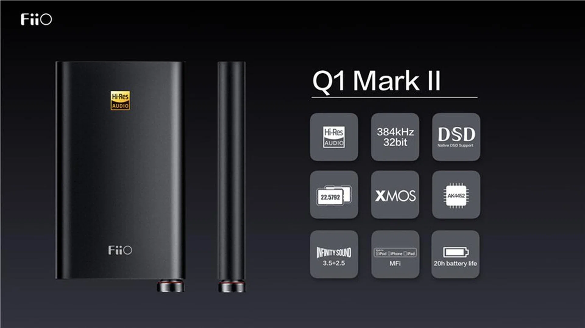 Speaking of DACs, FiiO has a brand new Q1 too! The Q1 Mark II is a MFi certified DAC/Amp with Native DSD decoding capabilities that was built just for iOS users. It weighs just 101.5g, and is able to power headphones with impedance rating from 16-150Ω. As with all the other products, the Q1 Mark II is HRA certified (high resolution audio), and it supports a max sampling rate of 384kHZ/32 bit thanks to the XMOS platform.