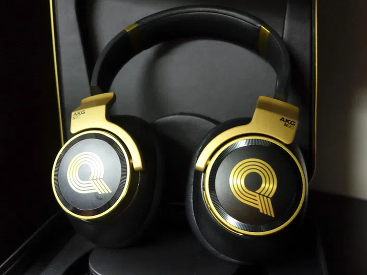 The AKG N90Q come in a gold hard case box for protection. The large "Q" printed on it stands for Quincy Jones, the 27-time Grammy award-winning record producer who worked extensively with AKG in the production of these special headphones.