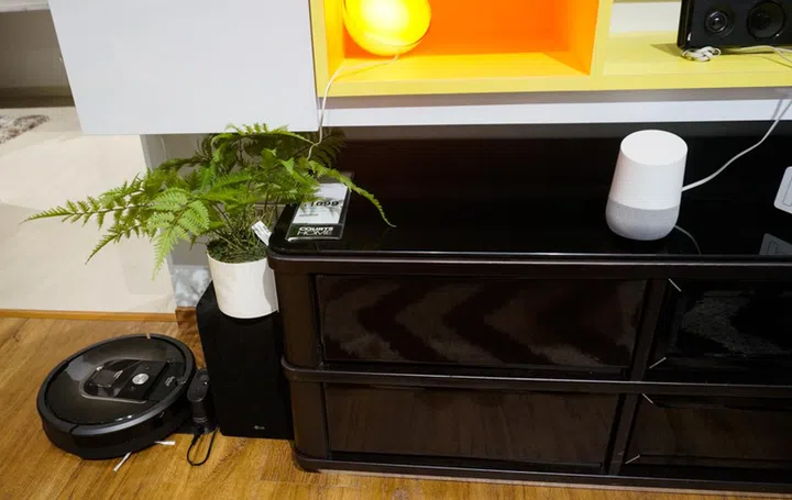 There's also a smart vacuum on the floor, and this can also be controlled through voice using the Google Home smart speaker.