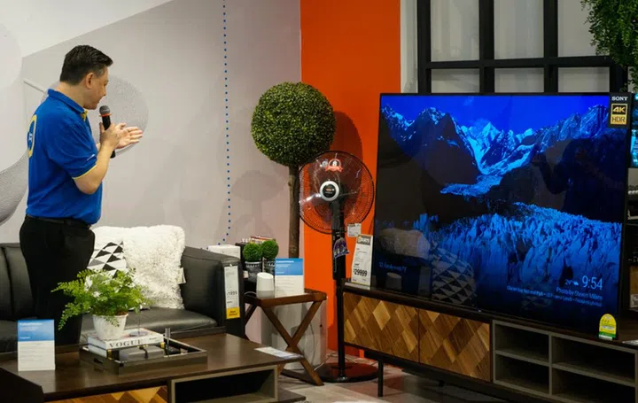 Country CEO (Singapore) of Courts Ben Tan shows off how he can use the Google Home speaker to start a fan and get the connected TV to start the intro trailer for a movie.