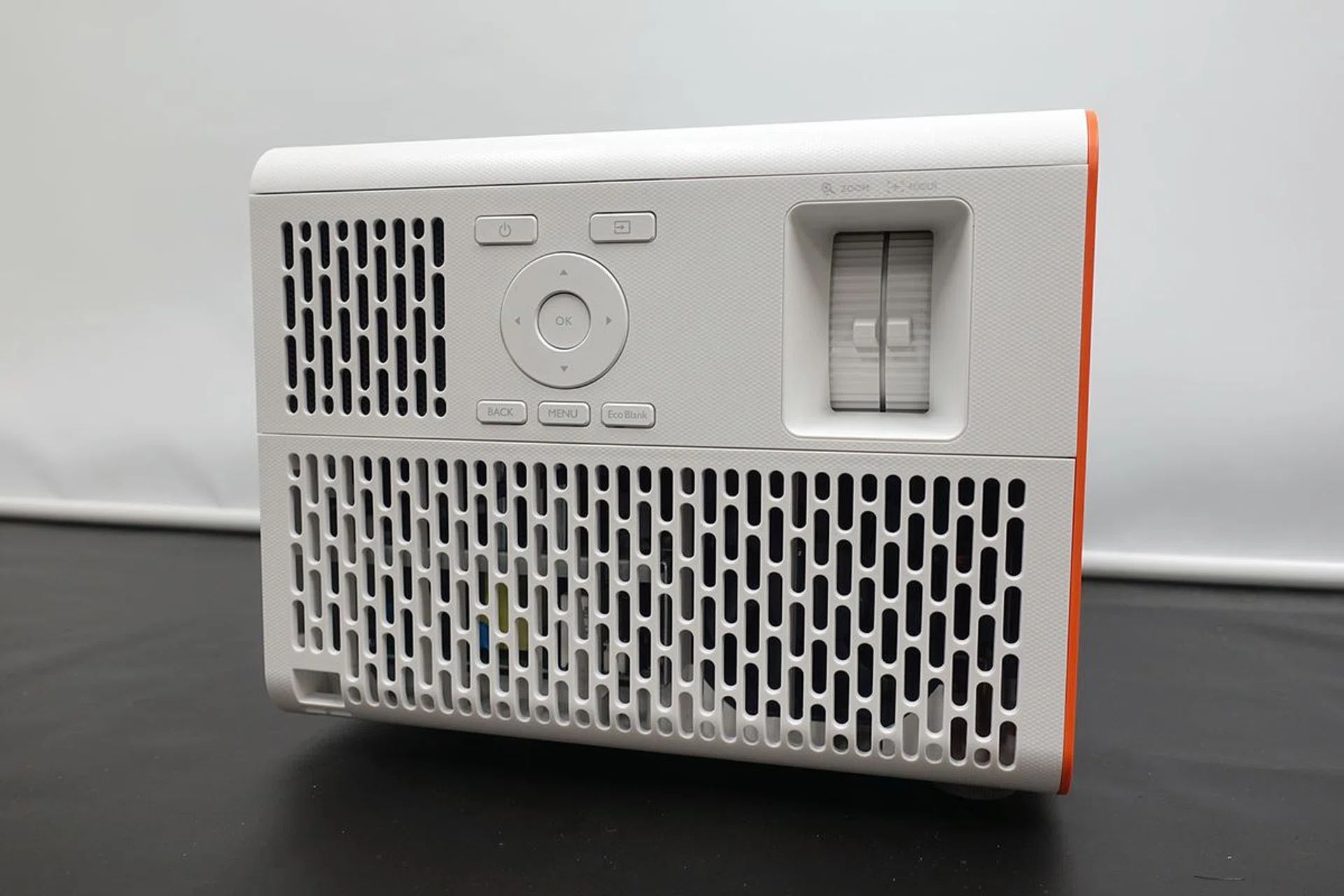 Most will think of projectors as large and cumbersome machines; well the BenQ X3000i isn't exactly compact, but it's decently sized and is easy to move it around your home. Its stylish modern cube design measures in at 272 x 197 x 259 mm (excluding the adjustable feet) and weighs 6.4kg. There are stylish vents wrapped around the sides of the projector, giving it a simple yet playful style. Ports are all on the back for easy access, while controls for settings and navigation – as well as the manual zoom and focus dials – are on the side.