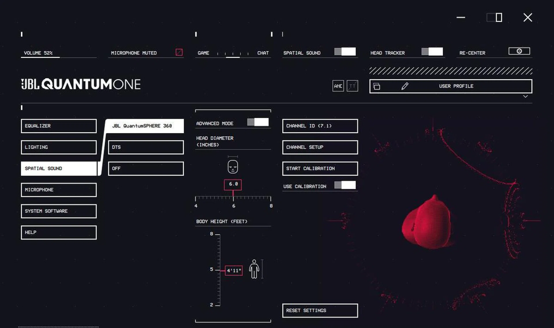 Much of its functionality is tied up in JBL's Quantum Engine software, which offers plenty of customisation options as well. When you first plug in the headset, you can calibrate it using the included calibration mic. The mic is covered by a foam tip that you insert into your ear, and the process is supposed to adjust the surround sound according to your ear structure. Then you'll also need to calibrate the head-tracking, and an onscreen gyroscope helps you ensure your head is in a neutral position before setting the central point of reference.