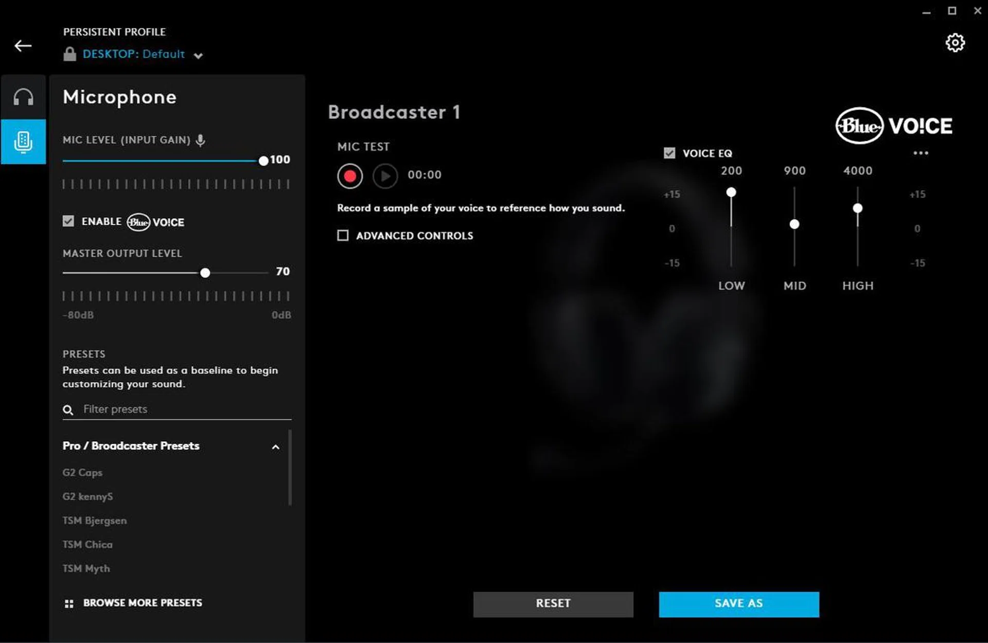 The G Pro X Wireless also comes with Blue Vo!ce functionality, which lets you apply custom EQ profiles to your voice, in addition to various presets. The latter includes things like Broadcaster 1 and 2, FM Station, profiles for high and low voices, and even so-called pro player presets from names like kennyS and Bjergsen. I don't really see the point of these player presets, and if anything, I found they made the microphone output sound worse. The G Hub software comes with a helpful mic test feature though, so you can record your voice and apply various presets or adjustments to it on-the-fly to see what you like best.