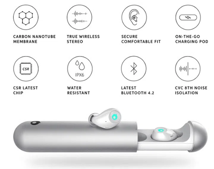 Using CSR’s latest audio SoC (not the CSR 8670), with an embedded TWS (True Wireless Stereo) chipset and Bluetooth 4.2 for wireless connectivity, this sleek wireless earbuds is also water-resistant (IPX6), and comes with a charging case (uses USB-C) to provide over 15 hours of listening time (a single charge lasts 3 - 4 hours). Also included are enough silicone eartips and sport sleeves for a secure fit in just about any ear.