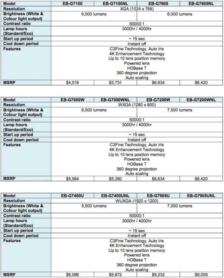 Finally, here's a list of models you can find in the EB-G7000 series, with their key specs and prices: