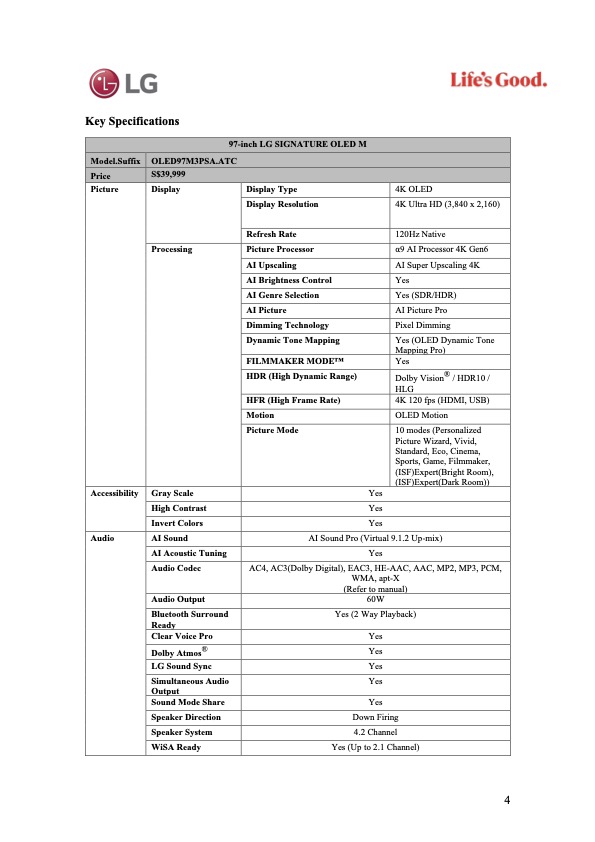 TV specs from LG