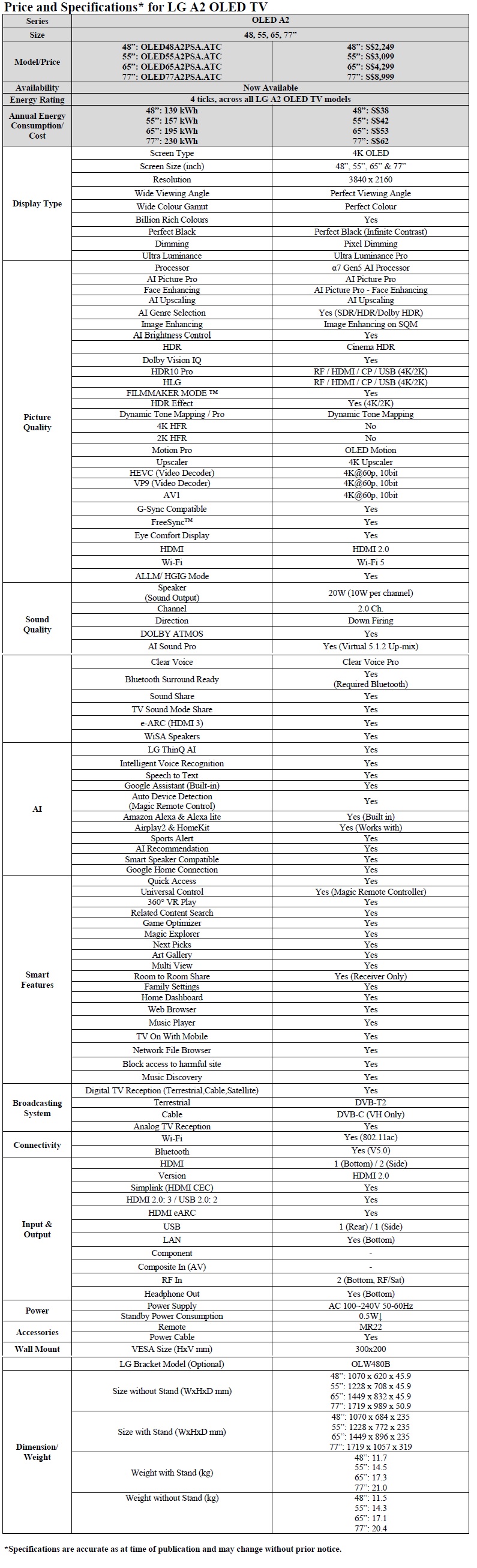 OLED55A2PSA.ATC | 55-inch | 4K OLED | S$3,099 | |
