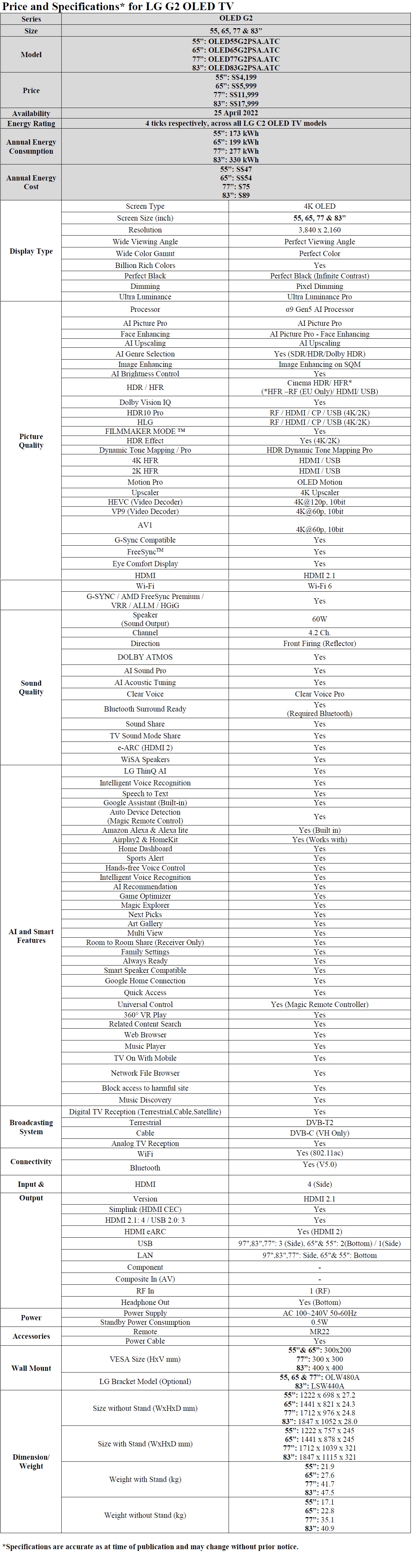 OLED65G2PSA.ATC | 65-inch | 4K OLED | S$5,999 | |