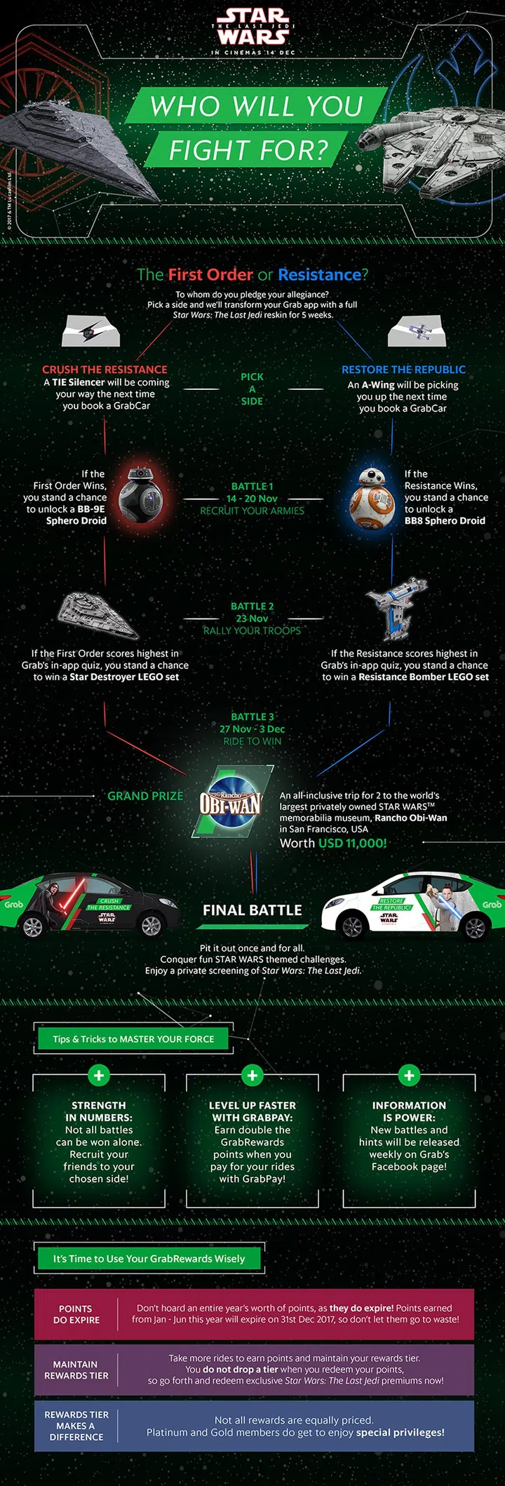 We’ve got about just about a month before the latest Star Wars movie (Star Wars: The Last Jedi) hits theatres, but Grab is already getting in the mood with a Star Wars campaign, where every ride you take gets you a better chance at redeeming exclusive Star Wars: The Last Jedi premiums, and a chance to win an all-expenses paid trip for two to the world’s largest privately-owned Star Wars memorabilia museum, Rancho Obi-Wan in San Francisco, California, USA.