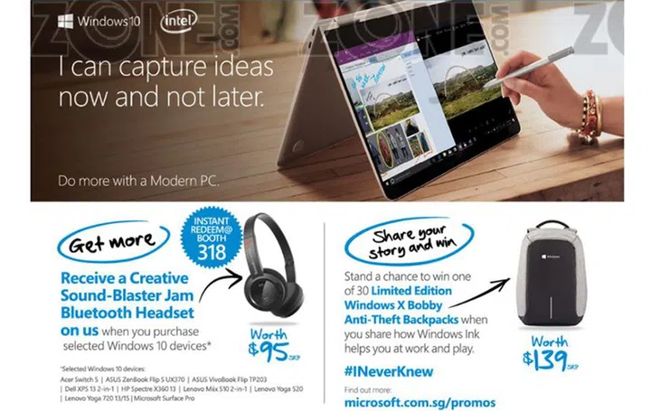 If you're planning on picking up a Windows 10 device at the upcoming Comex, make sure you stop by the Instant Redeem Booth 318 to collect your free Sound Blaster Jam Bluetooth headset. This is an ultra lightweight headset that uses high performance Neodymium drivers and Bluetooth 4.1 technology to give you energy-efficient wireless audio streaming for 12 hours straight. It normally retails for $69, so you might as well pick it up for free if you're getting one of the Windows 10 devices below: