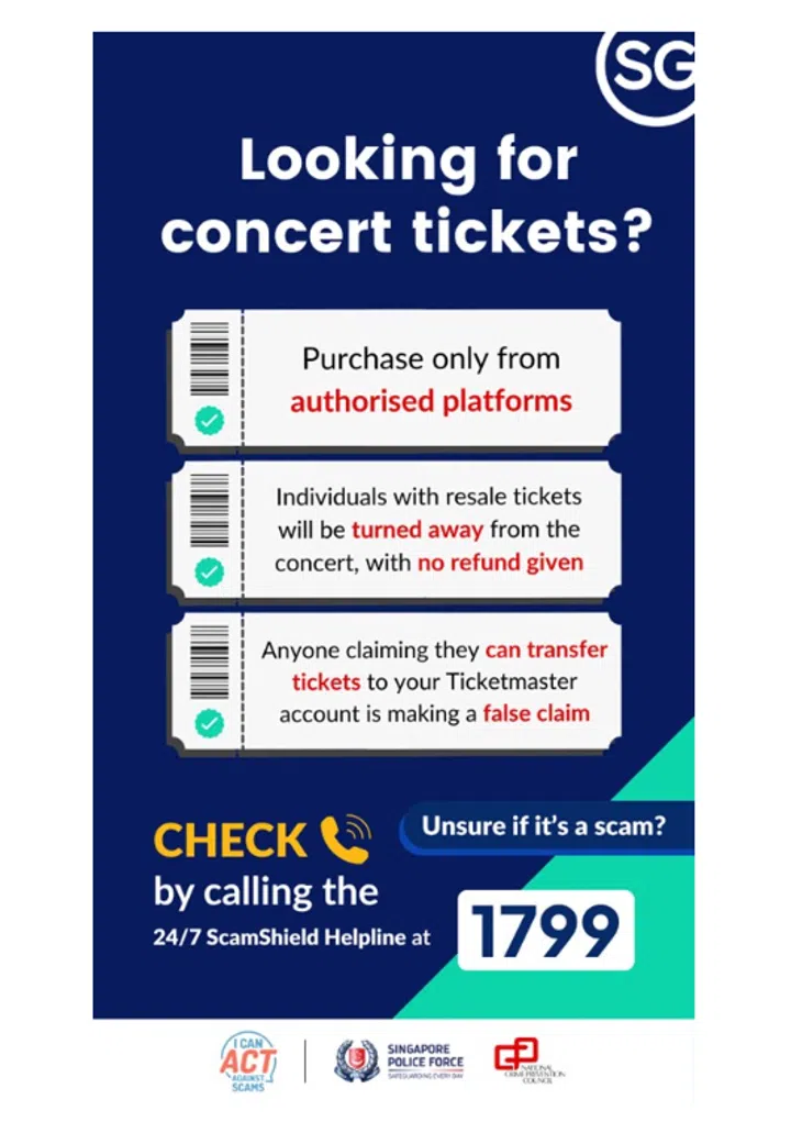 According to a Straits Times report in 2024, at least 2,000 victims fell prey to concert ticket scams between January and May last year, with losses amounting to at least S$1 million, mainly to fake Taylor Swift concert tickets.