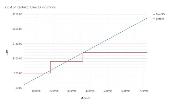 In the above chart, for a very short drive (<2.5 hours), driving a Blue Car makes much more sense than renting Smove. Things start to get contentious after that, but beyond approximately 270min (~4.5 hours), renting Smove is much cheaper. Still, this chart underscores that the market each service caters to is distinct from each other. (Besides, with only 200km driving range, it’s quite unthinkable to rent a Blue car beyond 2 hours, anyway)