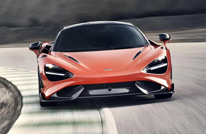 This is the McLaren 765LT, a more powerful and lighter version of the 720S. Its 4-litre twin-turbo V8 now produces 765hp (45hp more) and the car weighs 80kg less than a standard 720S. Weight is saved by using carbon fibre body panels and seats, forged wheels, titanium wheel nuts, and thinner glass. 0-100km/h takes just 2.8s and 0-200km/h happens in just 7.2s. Crucially, that’s faster than a Ferrari 488 Pista. It also has four central tailpipes, which is also more than the Pista.