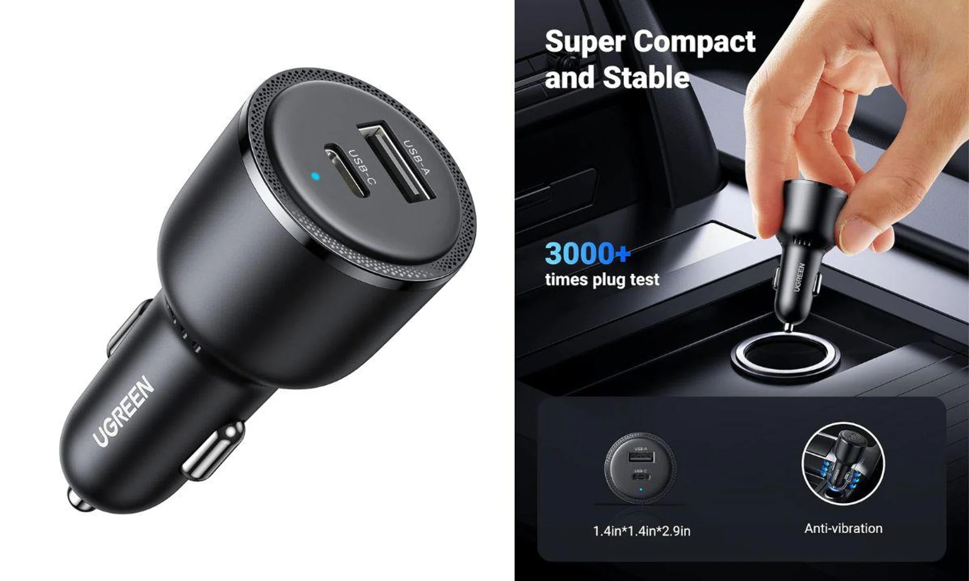 No more low-battery worries on the road! This compact car plug works with USB-C and USB-A tablets, phones and other devices, allowing you to charge two devices at the same time. It also has built-in intelligent circuit design, preventing your devices from overheating or short-circuiting.
