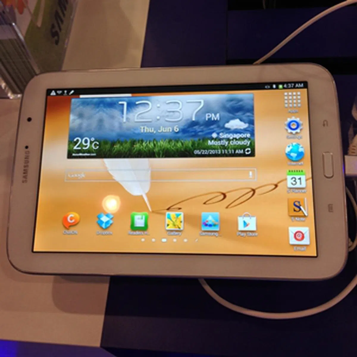 Samsung Galaxy Note 8.0 The Samsung Galaxy Note 8.0 runs on Android 4.1.2 Jelly Bean and has a 8-inch display (1,280 x 800 pixels). It is powered by a quad-core 1.9GHz processor and 2GB RAM. The Galaxy Note 8.0 is rather portable at 338g and measures just 7.95mm thin.PC Show 2013 Offer
