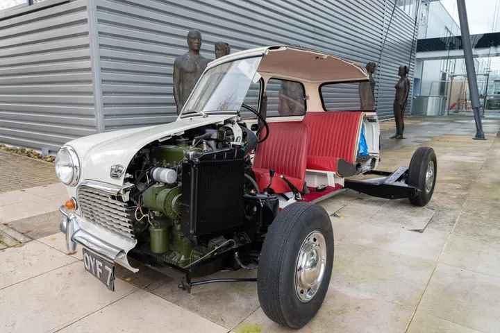 Dyson engineers gave this half-sawn 1961 Austin Mini to Sir James Dyson for his 60th birthday. Dyson collects engineering marvels like other people collect art pieces, as both historical and inspirational artifacts. The Mini represents a breakthrough in car design, by mounting the engine transversely and setting the gearbox down in the sump, its engineers significantly reduced the size of the car while freeing up 80 percent of the space for passengers and seats.