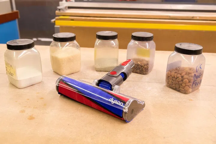 In the pick-up lab, Dyson tests how well its vacuum cleaners sweep up all manner of dust and debris, including dog food (far right canister). The assortment of dust in the lab is enough to make any dust connoisseur swoon (if there’s even such a thing).