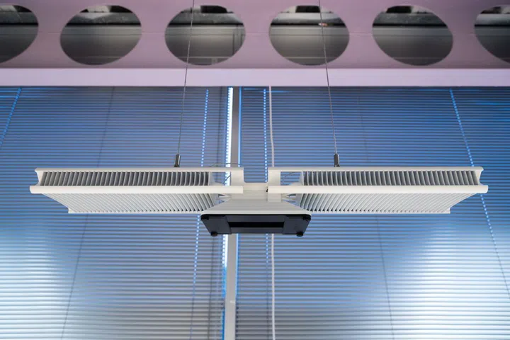 In 2015, Dyson bought his son’s lighting company, Jake Dyson Products. This is one of Jake Dyson’s inventions, the Cu-Beam down-light. Designed for the office, the ceiling mounted light uses LEDs to evenly illuminate the working space, and heat pipes dissipate heat away from the LEDs and into the wings.