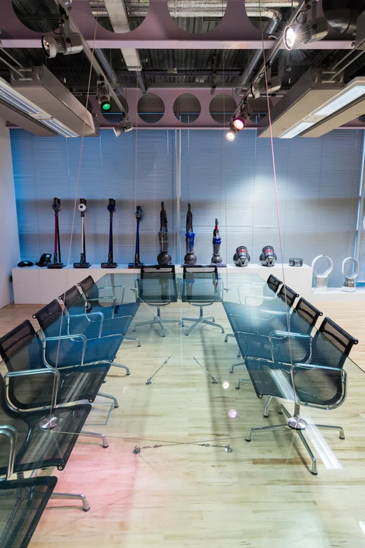 This glass table in one of the Dyson meeting rooms is also an engineering feat - it has no feet, and is entirely suspended by wires.
