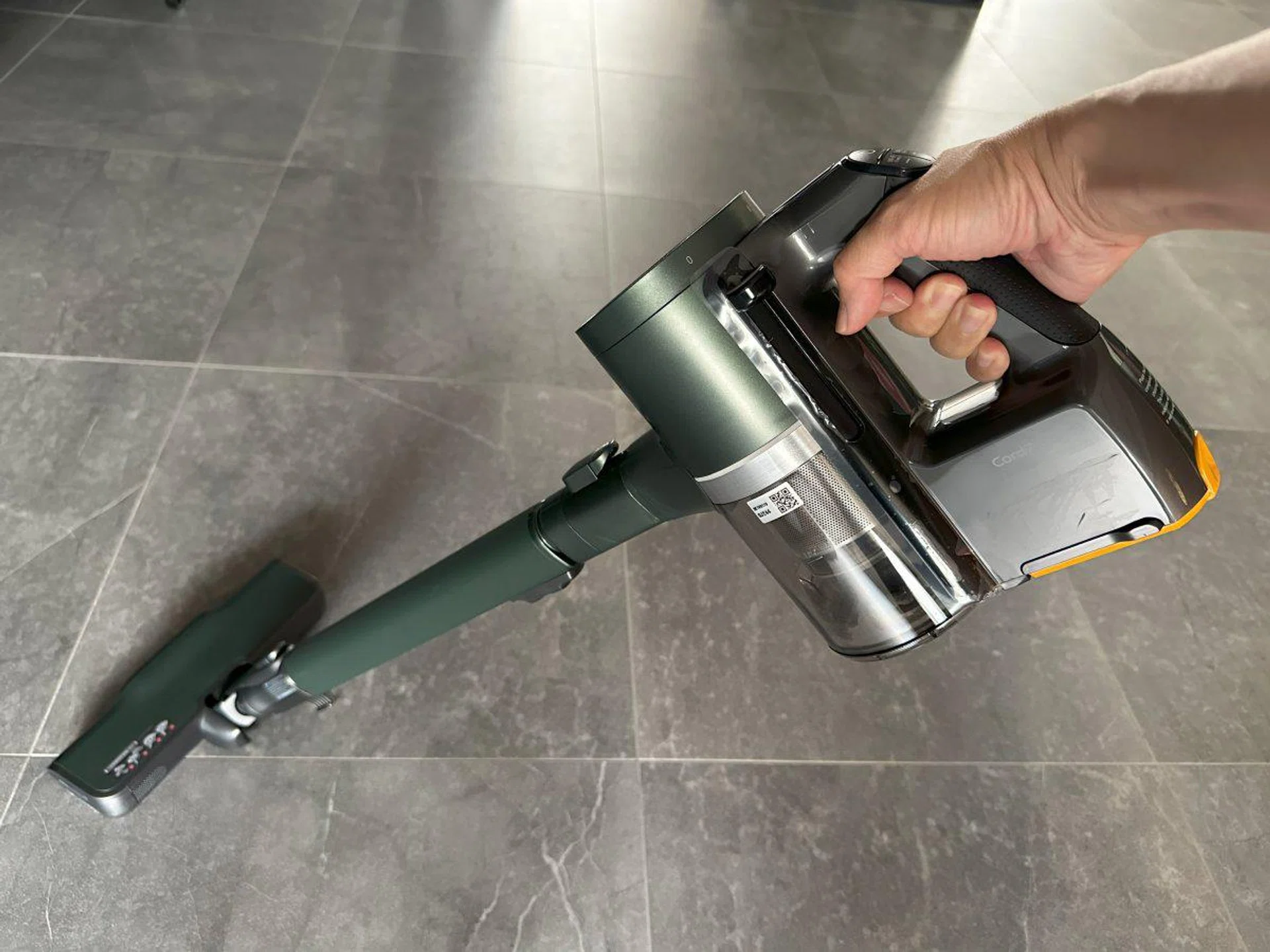 Ergonomically, I’m not a fan of LG’s vertical arrangement of its motor, bin, and battery pack, which all sit as a perpendicular block at the handle. This means it’s incredibly bottom-heavy. During use, I find that supporting the entire weight of the vacuum on my wrist tires me out faster than the Samsung Bespoke Jet (as well as the newer Bespoke Jet AI), which has its motor positioned diagonally along the length of the vacuum. The A9T-Steam also has a basic control cluster with a power button, and +/- buttons to switch between two levels of suction power: Normal and Power. A third Turbo mode, requires you to hold down the "+" button for 3 seconds. According to LG’s own estimations, the vacuum should last about 40/20/10 minutes in Normal/Power/Turbo modes, respectively.