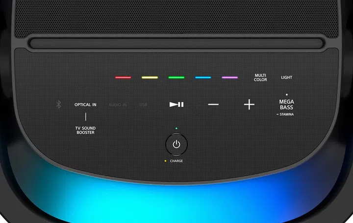 SRS-XV900 has a built-in carry handle, a set of castor wheels for easier transportation, given how it's 26.6kg. There's a USB slot (USB-A at 5V/1.5A) for music stored on a thumb drive and for charging mobile phones. There’s also a top touch panel for controlling its party lights, settings, and playback on-the-go.