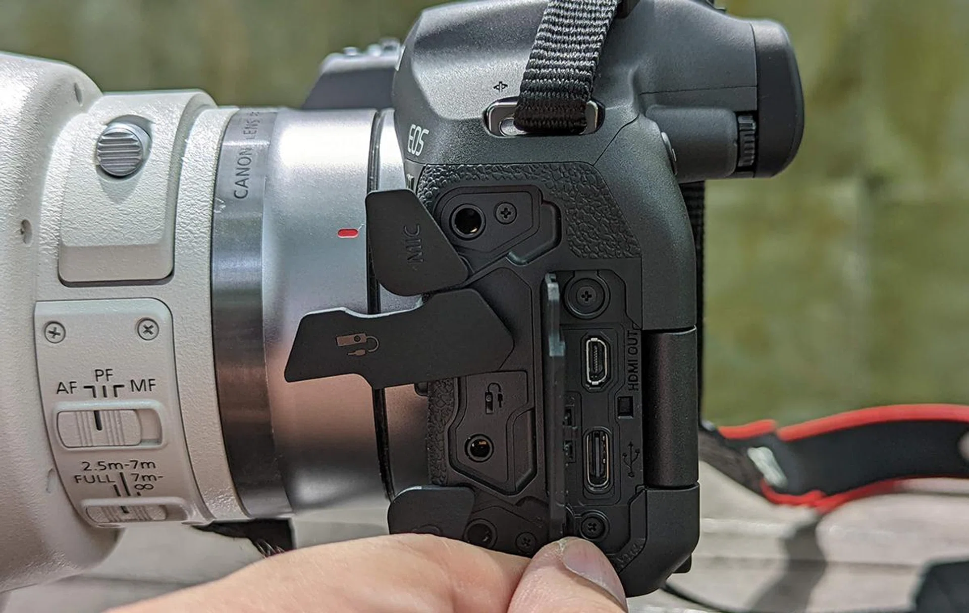 On the camera's right side is a compartment that houses two UHS-II SD card slots. There are more ports on the left with a microphone port, a headphone jack, a quick-release port, an HDMI port, and a USB-C port - all protected by silicone flaps.