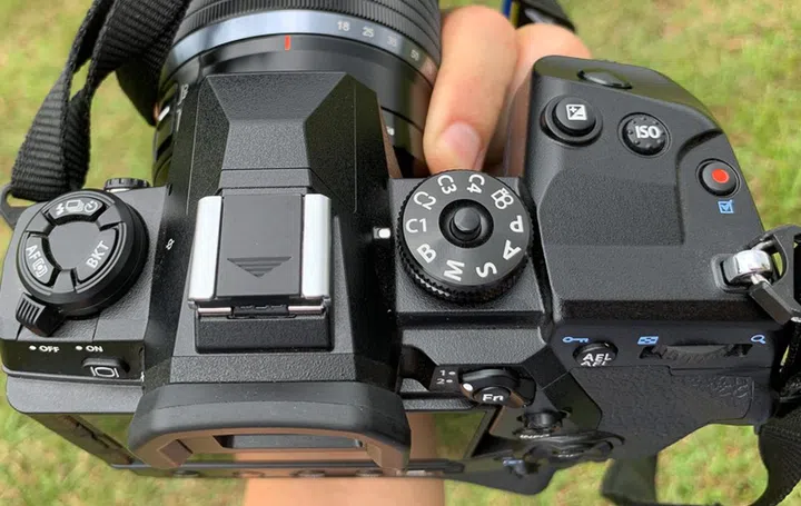 As you can see, there's no top information LCD panel on the E-M1X. What you get instead, are more custom buttons you can assign features too. Four sets custom shooting settings can be accessed right from the top dial, making it easy to adapt to different scenarios.