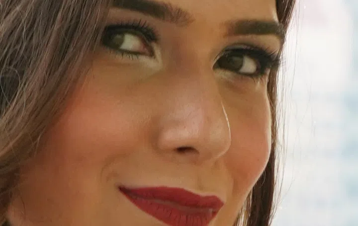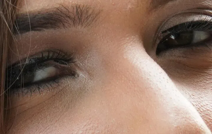 Eyelashes, strands of loose hair, even details in her eyebrows can be made out, though we do suspect we would have got more detail if we used flash and a higher shutter speed. (100% crop)