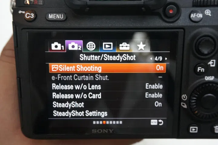 Of course, silent shooting is also an option, and this is found in the menus, on the fourth page of the Shutter/SteadyShot sub-menu.