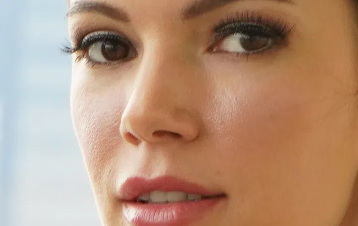 With the model on the right you can see that the eyes aren’t quite in perfect focus, though there is enough detail to capture skin texture and yet still make out her eyelashes. (100% crop)