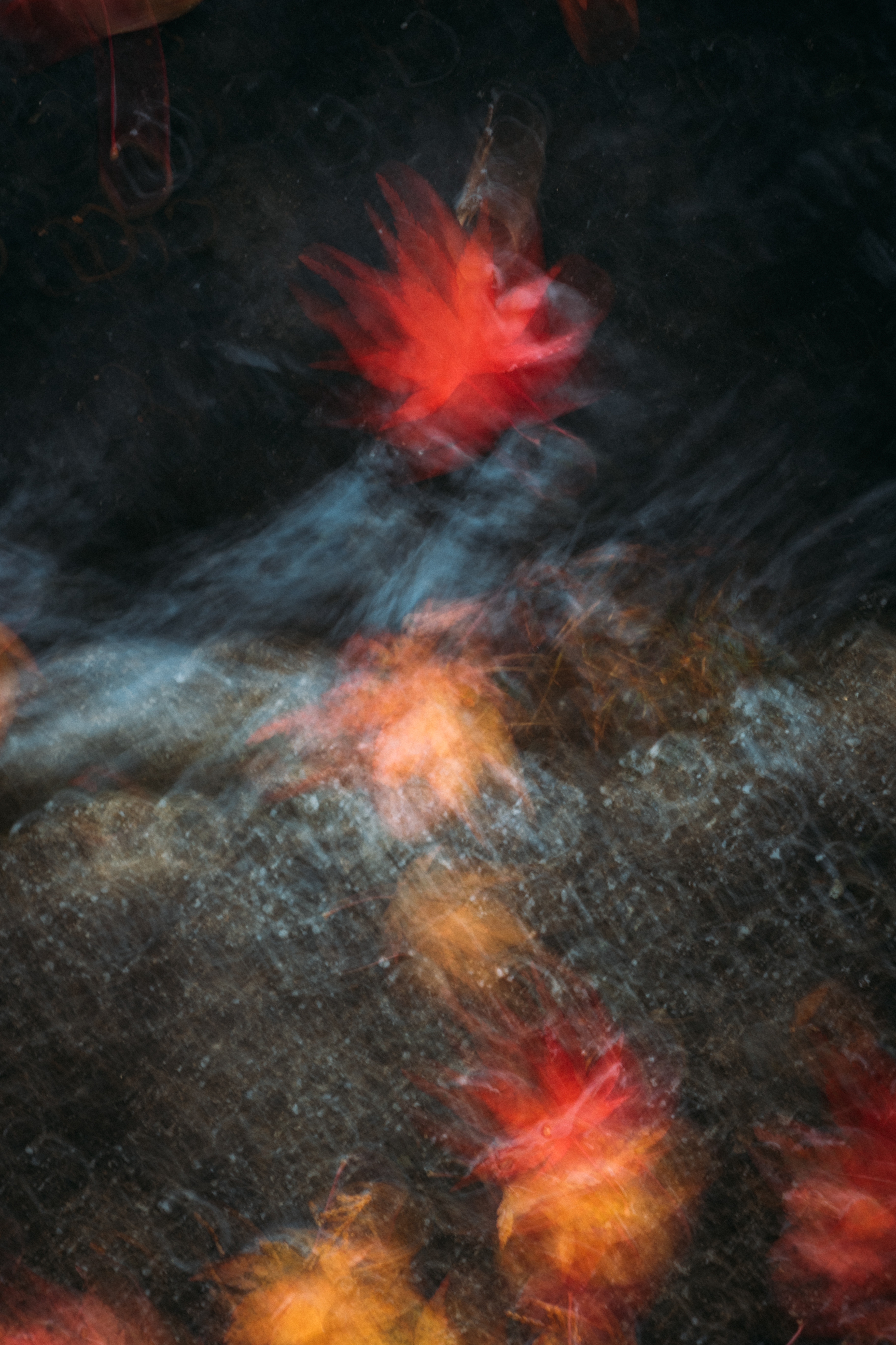 The light was flat, and I couldn’t find anything to photograph. In the middle of my frustration, I asked myself what my most immediate impression of the place was: wet, wet, and more wet. So I picked that as a theme to work with. I found some autumn leaves, lying in puddles on the street, and began to play around. I’d recently been experimenting with a slow shutter technique (inspired by photographer David duChemin), where you slow the shutter speed and intentionally move the camera to create an abstract, impressionistic picture.