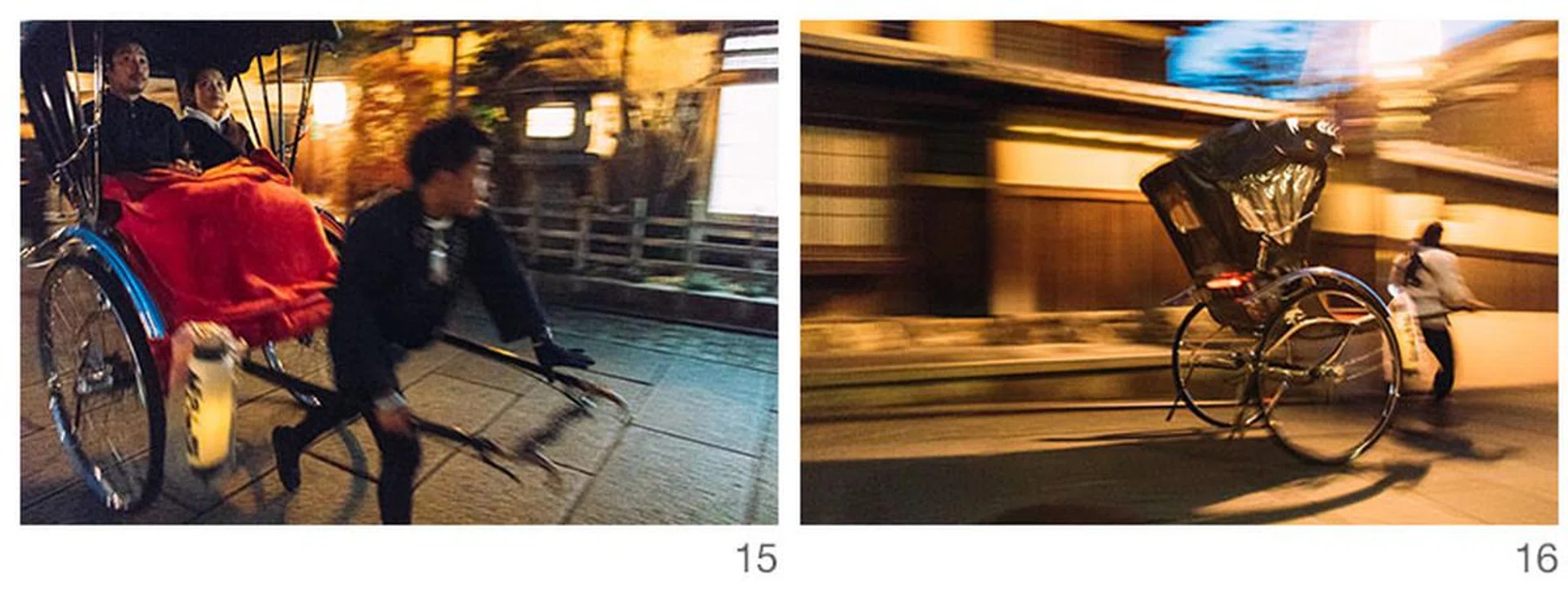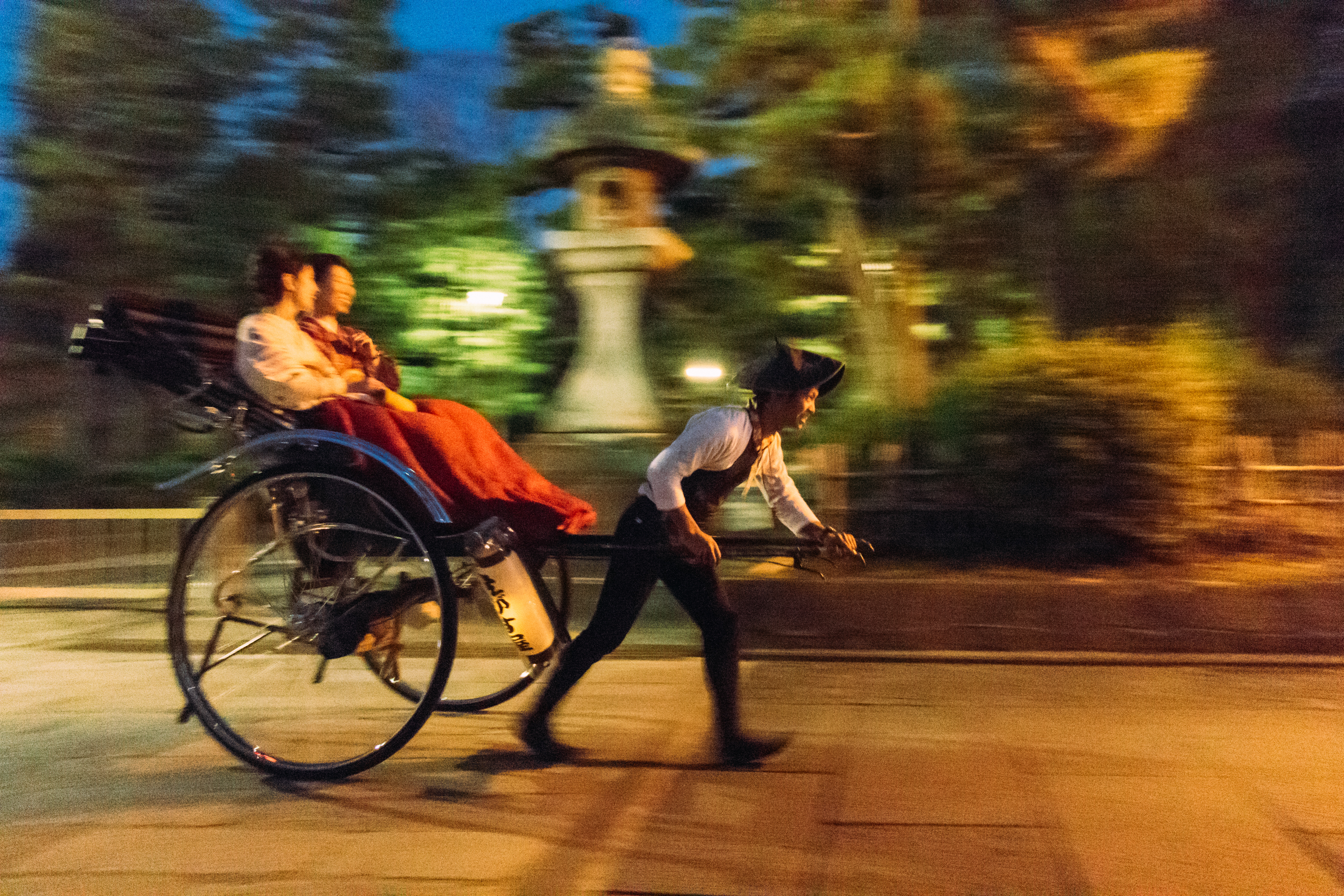 The problem is that it was getting dark — I mean, really dark. My shutter speed was getting slow, the ISO was getting high. But I decided to just keep shooting — after all, I’d already been failing the whole day, why not fail a little more? The trick was to catch when these guys would run into both the light provided by the streetlights, and shoot against backgrounds that said ‘old Japan’. I saw this guy approaching a streetlight, in front of the perfect Japanese backdrop. Even better, he had two passengers dressed in traditional kimono.