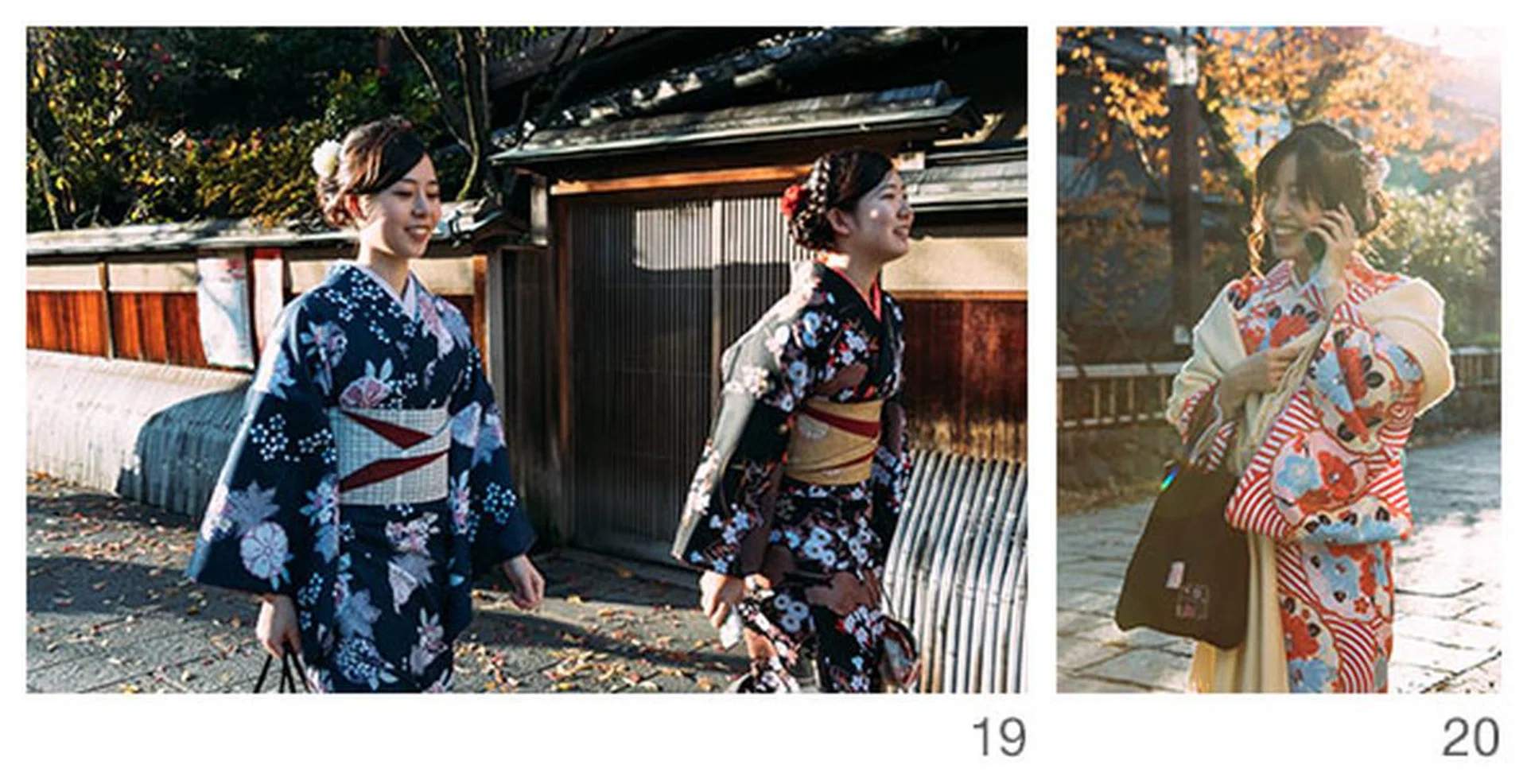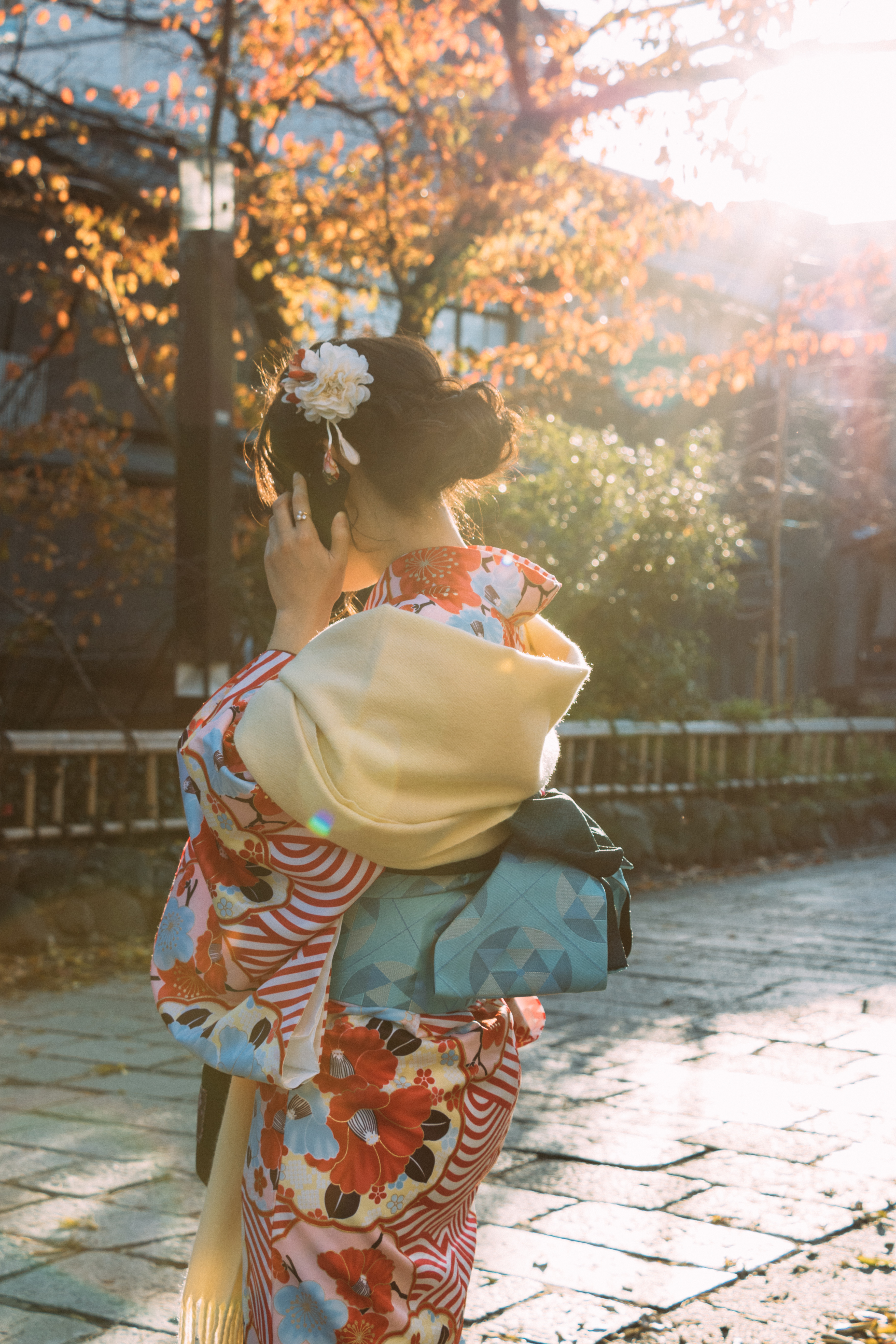 I have a few frames where she turned around to face and laugh into the camera (20), but I prefer this one where her back is facing us. The blue belt adds contrast to the reds of the kimono, and the lines created by her silhouette stand out beautifully. There’s also something more mysterious about not being able to see her face, don’t you think? If I show the photo of her facing the camera, then the shot becomes more about this particular woman. But with her back facing us, she represents something else altogether, not this particular person, but a symbol for the Japanese woman in general.