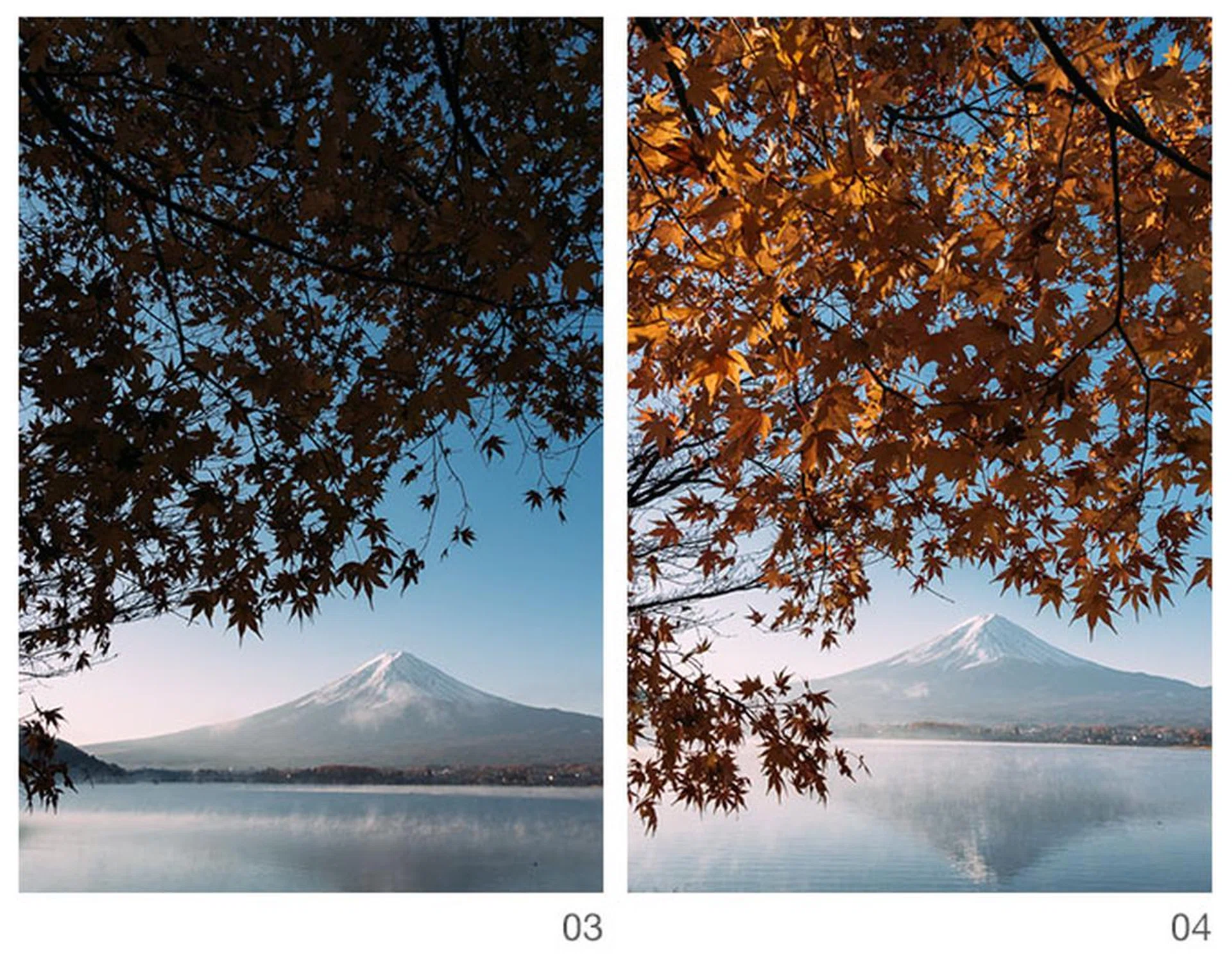 The next day, I woke before sunrise and cycled back to the places I’d scouted before. But I’d arrived ahead of time, and while Mount Fuji was getting some sunlight, the leaves were still dark and dull. I knew the light was going to change soon, so I just waited around 10 minutes (03, 04) until the sun crested the mountains and hit the autumn leaves, turning them from black to fiery red.