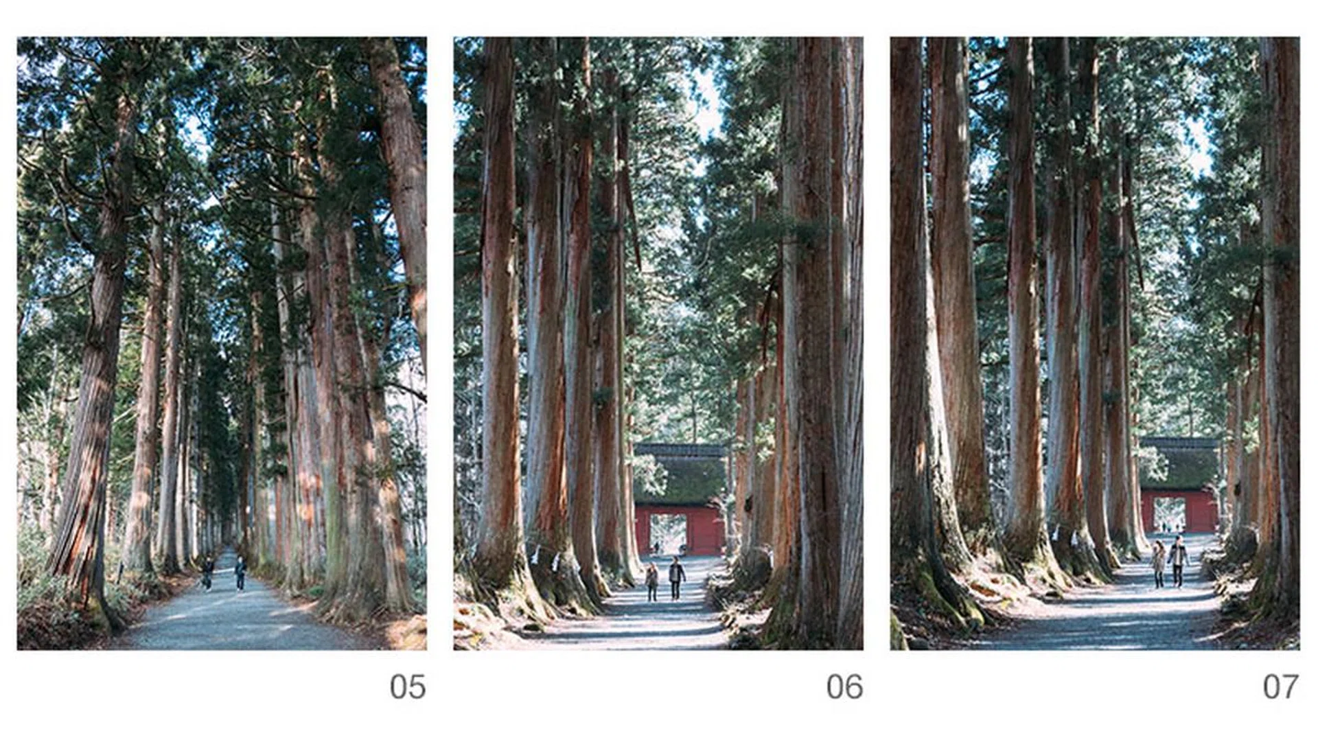 The cedar trees on the way to Togakushi Shrine were breathtakingly tall, and I wanted to express that in some way. Shooting with a wide angle exaggerated the lines the trees made (05), but it wasn’t the look I was after. Instead, I wanted to show how straight and tall the trees were.