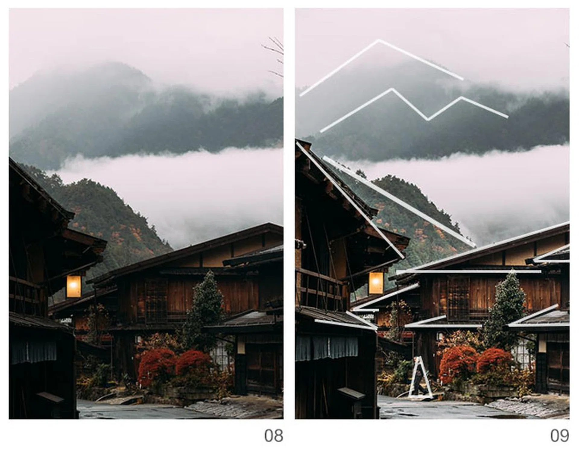 I was playing around with the composition on this photograph, when a man walked out of his house and gave me the focal point I needed. Without him, the picture would have been empty, without a subject for the eye to be drawn to (08). One reason why this photo works is because of the repeating triangles in it. The mountains, the roofs, and even the man’s pose create triangles (09). The repeating lines help to draw the eye in and down the image, and finally, a human figure helps to anchor the moment.