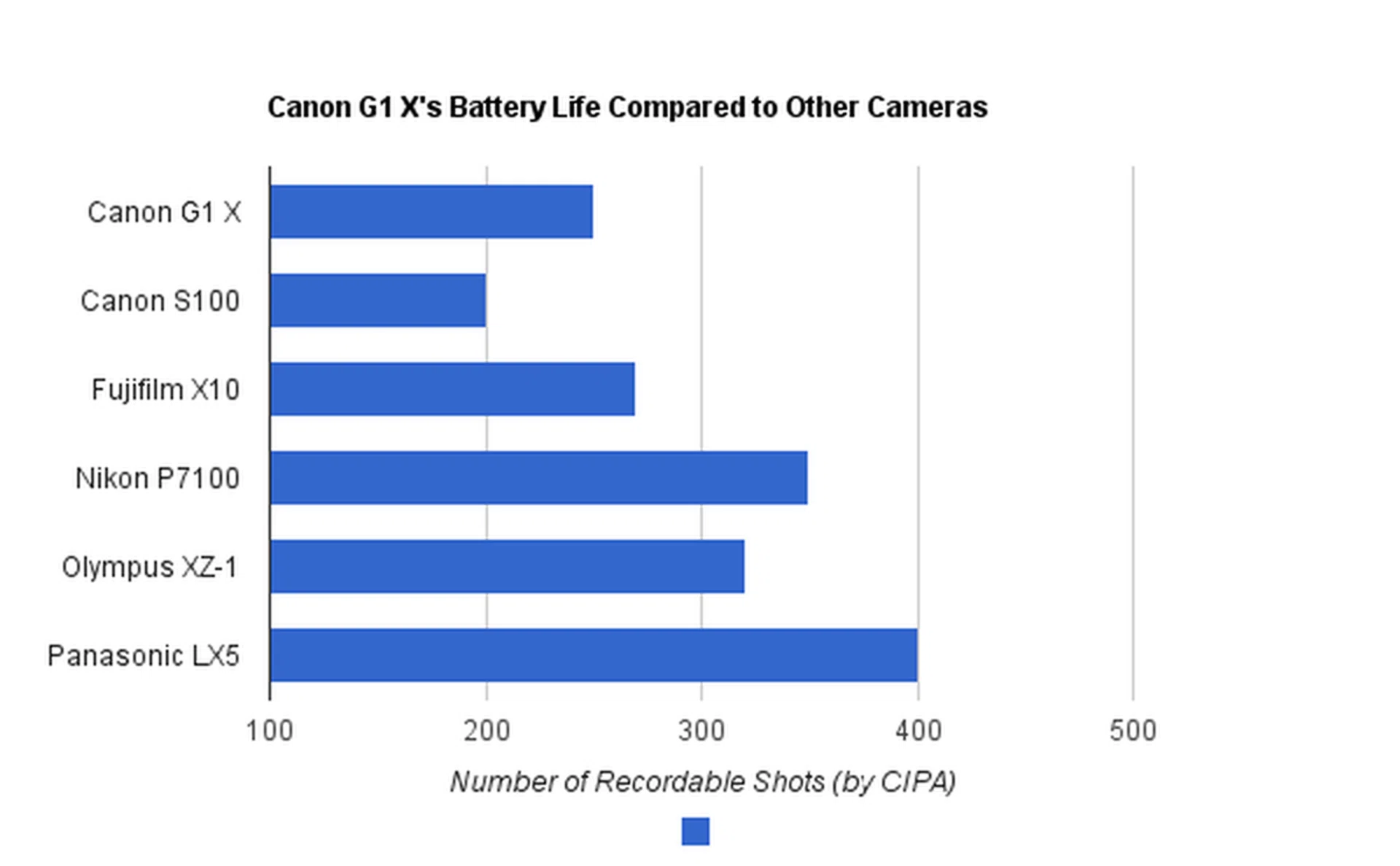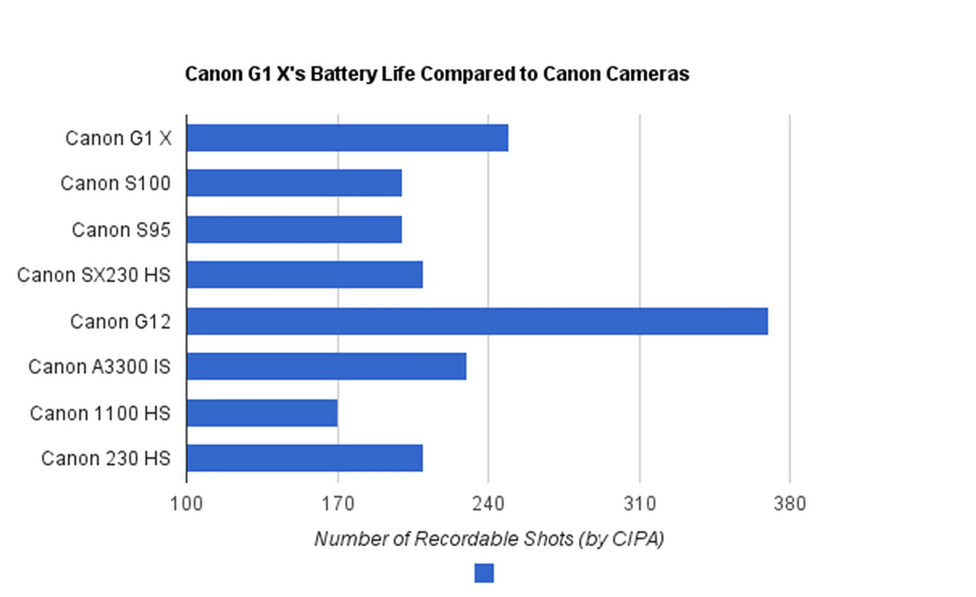 Like the Canon S100, the G1 X's battery is woefully short, much shorter than the G12's. The battery is rated for 250 shots, and we managed around 240 in a day of shooting on a full charge before the camera kept flashing a low-battery warning. We highly recommend you buy an extra battery if you get the G1 X.