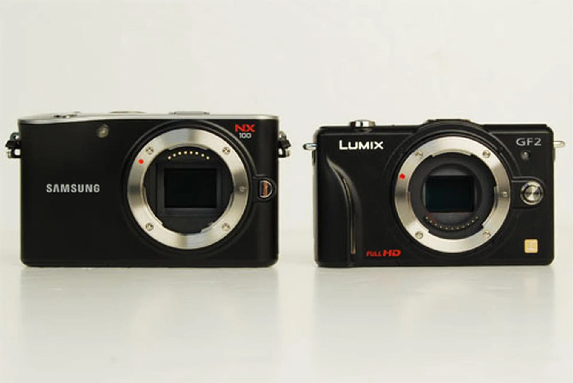 Announced in September 2010, the Samsung NX100 packs a larger APS-C sized sensor than the GF2's Micro Four Thirds sensor, so it's no surprise that the NX100 is slightly larger and also slightly heavier at 282g to the GF2's 265g.