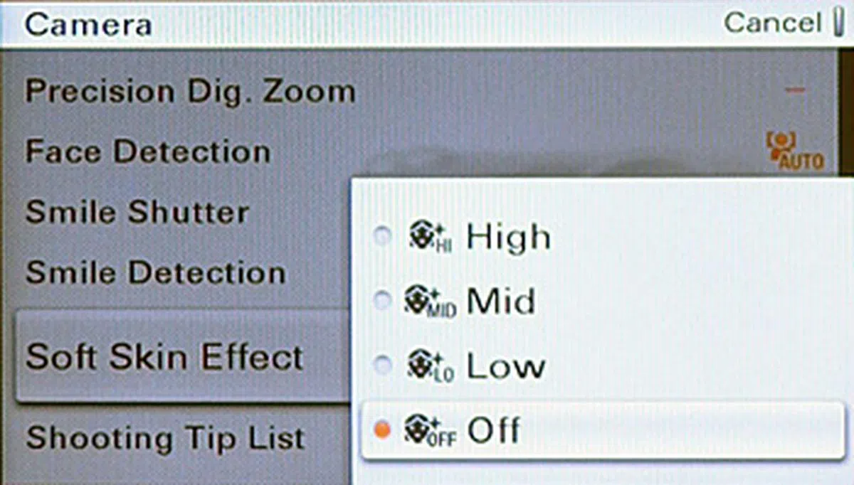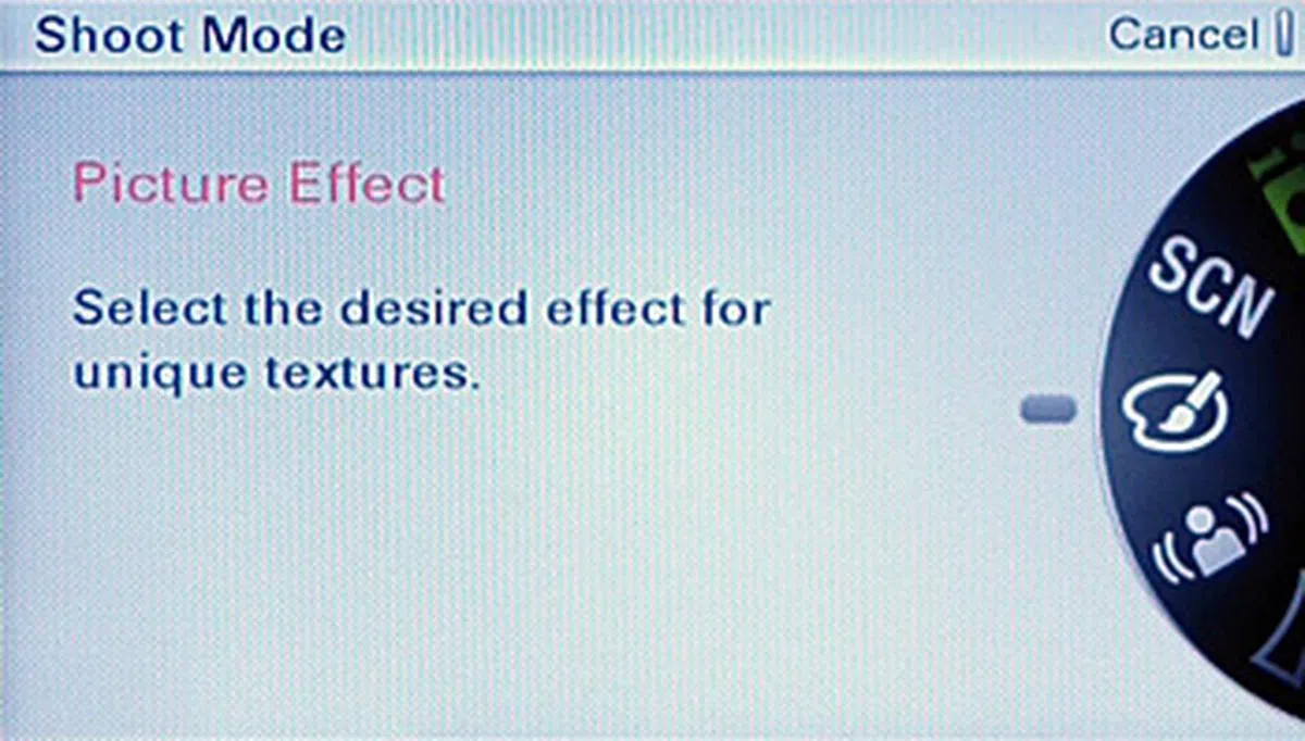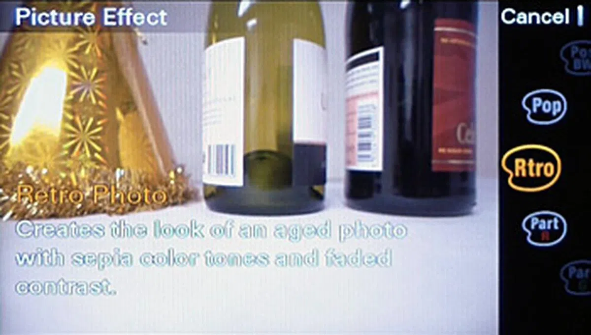 When iAuto is used, pressing the center button now calls up the new Photo Creativity interface. This is where most of the fun lies. The picture effects detailed above can be found here, along with the soft skin effect (surprise!); and other shooting and image parameters such as self-timer/continuous advance, color vividness, color tone, brightness, and background defocus. The cool part is that you're able to combine these parameters to come up with all sorts of interesting effects.