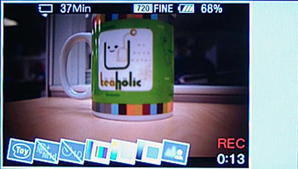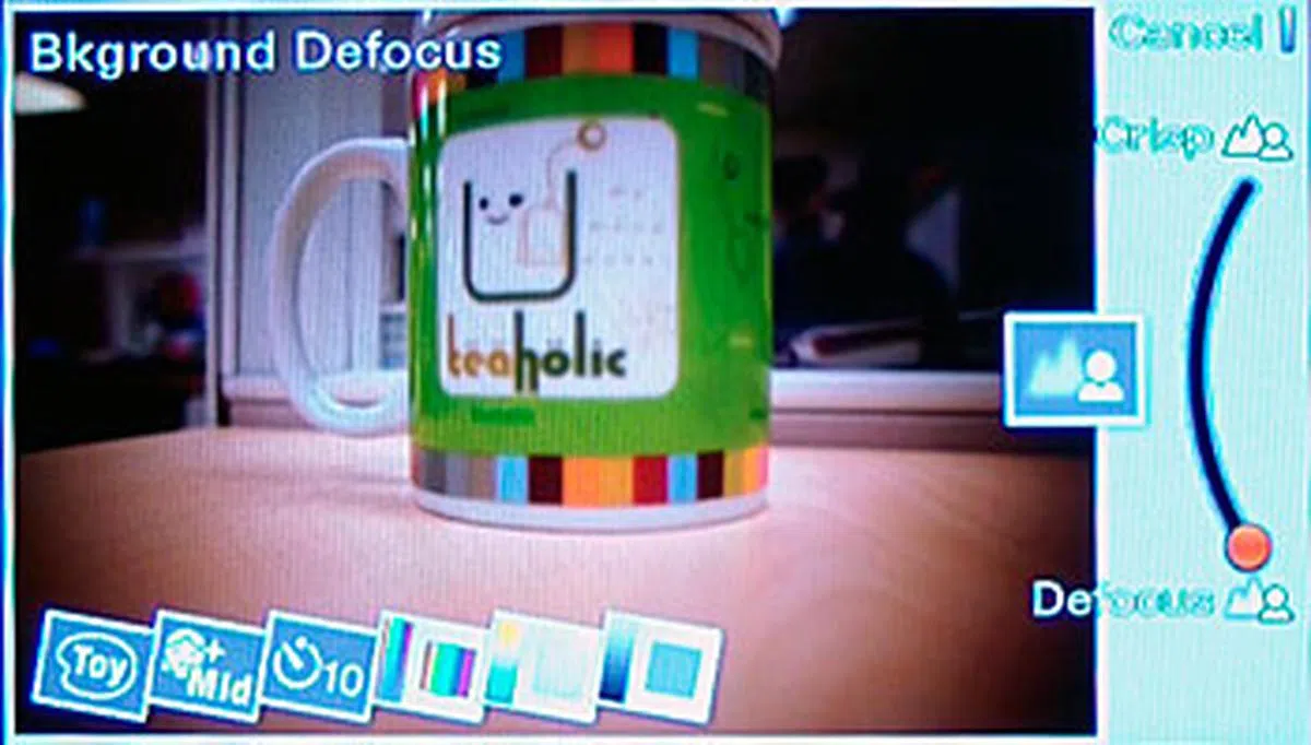 You can't combine two picture effects; choosing a new one would replace the existing one. To undo the last addition, press soft key B. To reset everything and start from scratch, press soft key A. Once you're happy with the instant preview shown on the screen, press the shutter release button to take a picture. Take note though, once you exit from the Photo Creativity interface, the "stack" will be lost. It'd be nice if we could save a combination or two for later recall, since it can be quite tedious to add the same items every time you turn the camera back on.